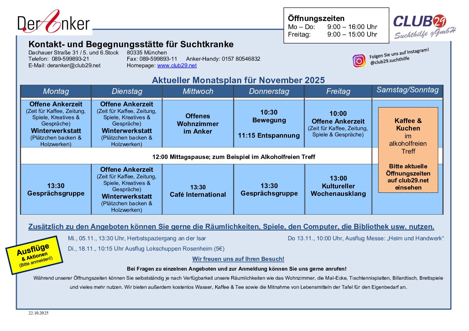 SuchthilfeWer eine Struktur für den Tag sucht, einen Anlaufpunkt, der zurückbringt ins Leben, ist im Anker genau richtig. Der Anker ist eine Kontakt- und Begegnungsstätte und offen für alle. Ohne Anmeldung, ohne Formulare, ohne Verpflichtung und ohne Kosten.