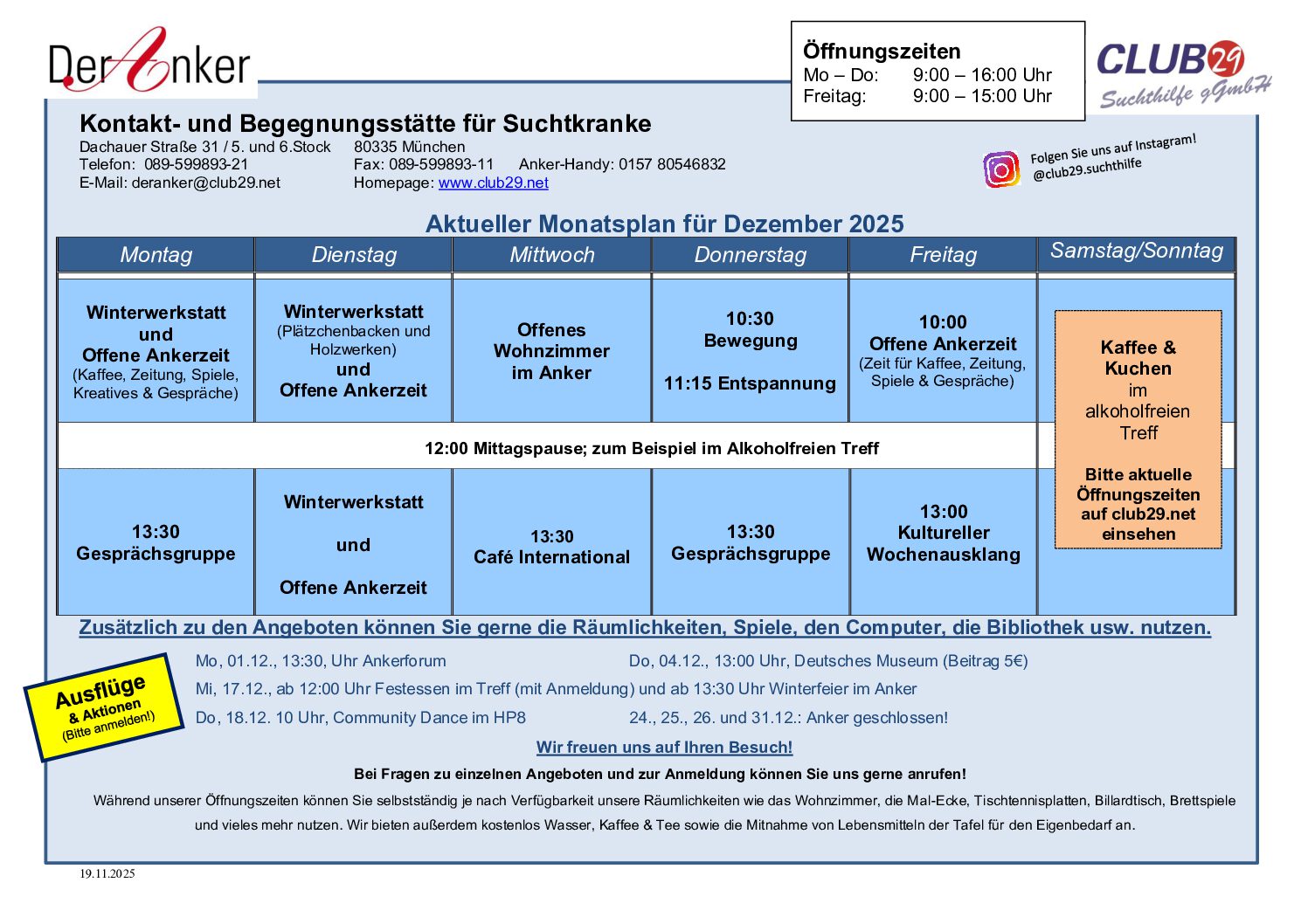 SuchthilfeWer eine Struktur für den Tag sucht, einen Anlaufpunkt, der zurückbringt ins Leben, ist im Anker genau richtig. Der Anker ist eine Kontakt- und Begegnungsstätte und offen für alle. Ohne Anmeldung, ohne Formulare, ohne Verpflichtung und ohne Kosten.
