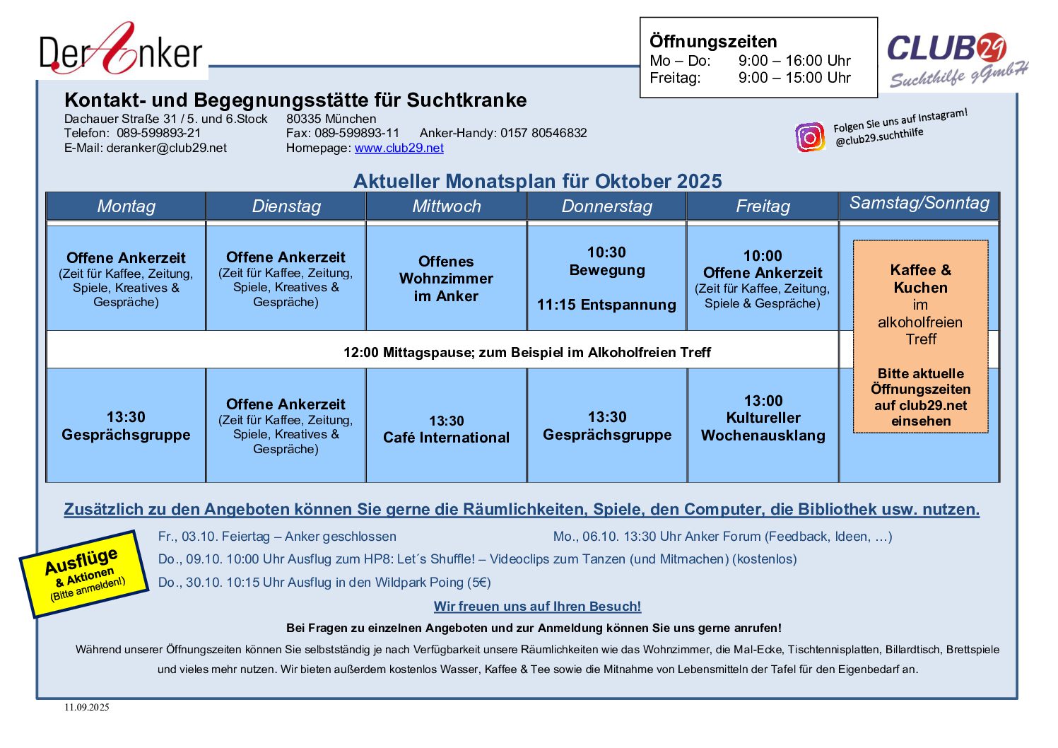 SuchthilfeWer eine Struktur für den Tag sucht, einen Anlaufpunkt, der zurückbringt ins Leben, ist im Anker genau richtig. Der Anker ist eine Kontakt- und Begegnungsstätte und offen für alle. Ohne Anmeldung, ohne Formulare, ohne Verpflichtung und ohne Kosten.